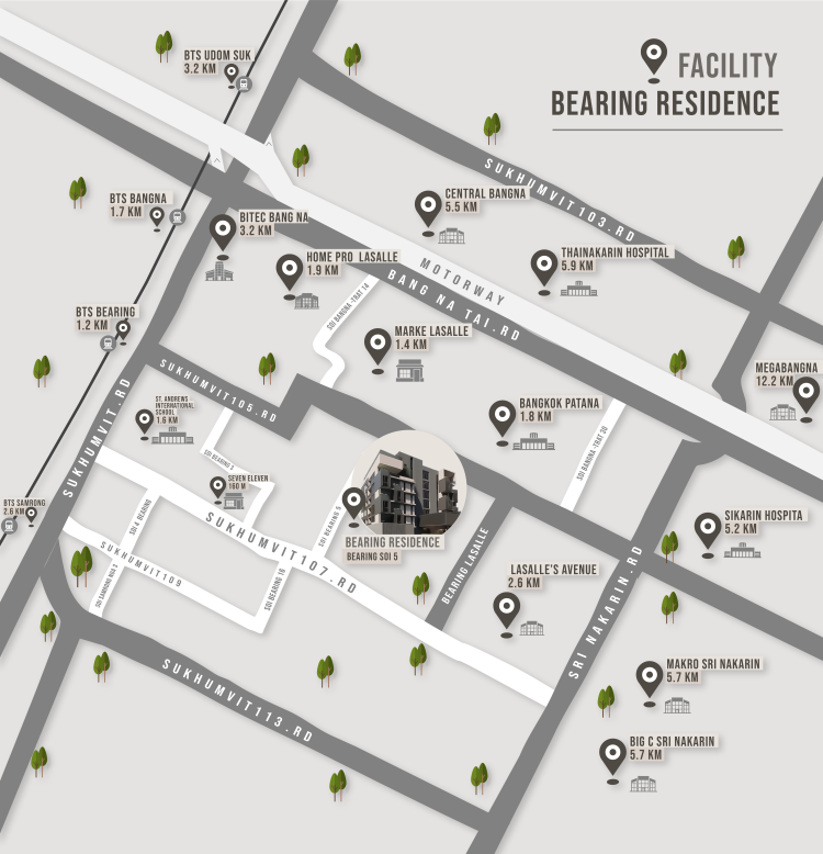 ACCESSIBLE FROM BEARING AND LASALLE MAKES BESRING RESIDENCE VERY CONVENIENT FOR FAMILIES WITH CHILDREN COMMUTING TO LEADING INTERNATIONAL SCHOOLS IN THE NEIGHBORHOOD, SUCH AS, BANNGKOK PATANA AND ST. ANDREWS.